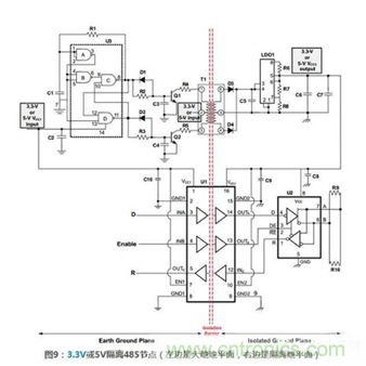 此外,使用低功耗計數(shù),可以使用小型隔離變壓器。如圖9所示,收發(fā)器使用SN65HVD10,當然任何TI公司3.3V或5V RS485收發(fā)器、3.3-V TIA/EIA-644 LVDS或者3.3-V TIA/EIA-899 M-LVDS收發(fā)器都可以使用這個電路。2.4.2操作原理圖9所示的例子可用于3.3V或5V,電源使用變壓器隔離,數(shù)據(jù)信號采用數(shù)字隔離器隔離。因為485收發(fā)器需要隔離電源,可調(diào)LDO穩(wěn)壓器必須被隔離。