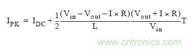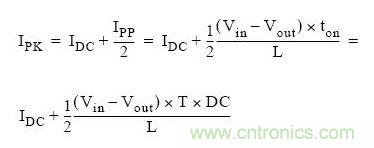 通過上圖我們可以看到,流過電感的最大電流為DC電流加開關(guān)峰峰電流的一半。上圖也稱為紋波電流。根據(jù)上述的公式,我們可以計算出峰值電流: