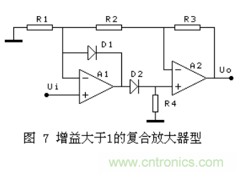 圖7,8,9三種電路,當運放A1輸出為正時,A1的負反饋是通過二極管D2和運放A2構(gòu)成的復合放大器構(gòu)成的,由于兩個運放的復合(乘積)作用,可能環(huán)路的增益太高,容易產(chǎn)生振蕩。