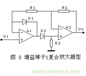 其它幾種,有的在D2導通的半周內(nèi),通過A2的復合實現(xiàn)A1的負反饋,對有些運放會出現(xiàn)自激. 有的兩個半波的輸入阻抗不相等,對信號源要求較高。