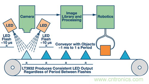 幸運(yùn)的是,LT3932高速LED驅(qū)動器可為高達(dá)2 A的LED串提供機(jī)器視覺相機(jī)閃光燈,關(guān)斷時(shí)間可以長達(dá)1秒、1小時(shí)、1天或更長時(shí)間。LT3932的特殊相機(jī)閃光燈功能允許其保持輸出電容和控制環(huán)路充電狀態(tài),哪怕是在長關(guān)斷時(shí)間內(nèi)。對輸出和控制環(huán)路電容的狀態(tài)進(jìn)行采樣后,LT3932繼續(xù)在長關(guān)斷期間對這些元件進(jìn)行涓流充電,以補(bǔ)償通常都會有的漏電流,而這是其他LED驅(qū)動器未予考慮的。