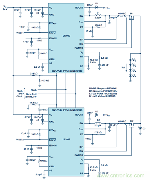 LT3932的專有閃光技術(shù)可以擴(kuò)展,驅(qū)動器可以并聯(lián)以提供更高的LED閃光電流。所需的閃光形狀和完整性保持不變。圖1顯示了并聯(lián)兩個驅(qū)動器以支持3 A相機(jī)閃光燈是多么容易,高達(dá)4 A的設(shè)計(jì)也是可行的。