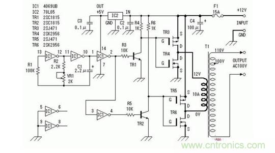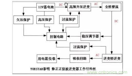 然后我們看一下整個(gè)過(guò)程的電路圖:12V直流→高頻升壓→220V直流→全橋整流→220V直流→逆變橋逆變→220V交流