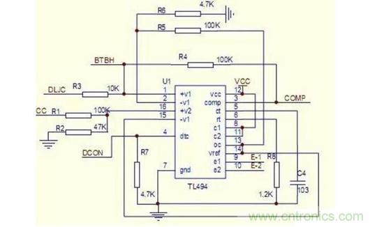 輸出脈沖的寬度是通過(guò)電容CT上的正極性鋸齒波電壓與另外兩個(gè)控制信號(hào)進(jìn)行比較來(lái)實(shí)現(xiàn)。功率輸出管Q1和Q2受控于或非門(mén)。當(dāng)雙穩(wěn)觸發(fā)器的時(shí)鐘信號(hào)為低電平時(shí)才會(huì)被選通,即只有在鋸齒波電壓大于控制信號(hào)期間才會(huì)被選通。當(dāng)控制信號(hào)增大,輸出脈沖的寬度將減小。(7)腳接地端,(8)、(11)腳是Q1和Q2內(nèi)部開(kāi)關(guān)管的集電極,在此電路中接電源,(9)、(10)腳為Q1、Q2的發(fā)射極,作開(kāi)關(guān)管驅(qū)動(dòng)輸出端,接下圖中Q1與Q2外部放大電路。以驅(qū)動(dòng)后極推挽電路。(12)腳電源端,(13)腳為輸出控制端,接(14)腳基準(zhǔn)電壓時(shí)兩路輸出脈沖相差180方位,每路輸出量大約200MA的驅(qū)動(dòng)推挽或半橋式電路。(15)、腳第二組放大器的反相輸入端,接基準(zhǔn)電壓, (16)腳同相輸入端,檢測(cè)電源電壓。當(dāng)電壓過(guò)高超過(guò)(15)腳參考電壓時(shí),(3)腳輸出高電平,電路進(jìn)入保護(hù)狀態(tài)。