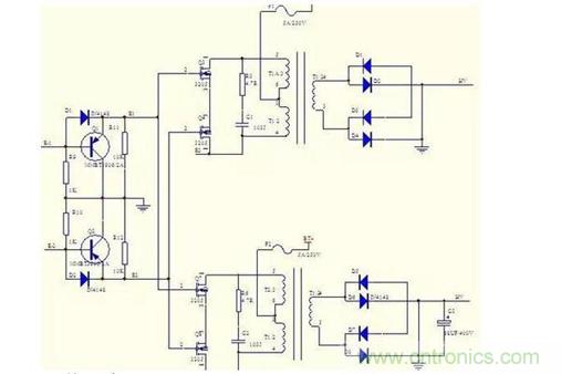這是一個(gè)推挽式拓?fù)淠孀冸娐罚?dāng)E1驅(qū)動(dòng)脈沖驅(qū)動(dòng)時(shí),Q1導(dǎo)通,使VT3、VT6導(dǎo)通,VT7、VT8截止,此時(shí)電路進(jìn)行正半周波形放大,變壓器升壓到次級(jí),通過(guò)高頻整流管整流,當(dāng)E2脈沖驅(qū)動(dòng)時(shí),Q2導(dǎo)通,驅(qū)動(dòng)VT7、VT8導(dǎo)通。VT3、VT6截止,進(jìn)得負(fù)半周波形放大。經(jīng)升壓變壓器升壓后,高頻整流。