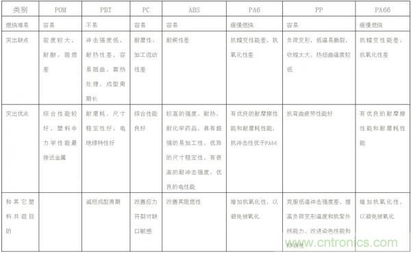 常用的材質(zhì)主要有PA6、PA66、ABS、PBT、pp等,筆者總結(jié)了它們的具體性能差異,見(jiàn)表2。設(shè)計(jì)插件時(shí)可根據(jù)不同的需求選擇不同的材質(zhì),還可根據(jù)實(shí)際情況在塑料中添加阻燃或增強(qiáng)材料,以達(dá)到增強(qiáng)或阻燃的目的,如添加玻璃纖維增強(qiáng)等。