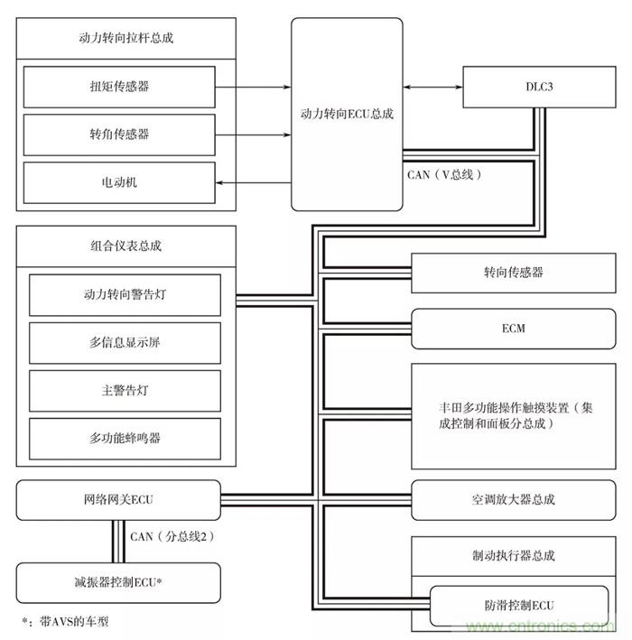 在分析方框圖了解信號或電流傳輸過程時,應(yīng)認(rèn)真查看圖中的箭頭方向,箭頭方向表示信號的傳輸方向。如果沒有箭頭方向,則可根據(jù)方框圖的圖形符號來判斷。箭頭如果是雙向的,表示信號既能輸入也能輸出;方框圖中粗線條表示CAN總線,下圖所示為2016 款皇冠EPS系統(tǒng)方框圖(系統(tǒng)圖)。對方框圖有整體的了解后,應(yīng)進(jìn)一步弄清系統(tǒng)(整車或系統(tǒng))共有幾個框(多少部件),框與框之間存在何種關(guān)系,再對照電路原理圖,就可以對電路理解得更為深刻。