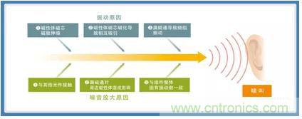 導致產(chǎn)生功率電感器嘯叫的振動原因以及噪音擴大原因如圖4進行了總結(jié)。以下對這些原因的主要內(nèi)容進行說明。