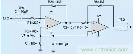 請(qǐng)注意,這款電路只適用于單電源供電的設(shè)計(jì),其中輸入及輸出電容器(C1及C4)只是選項(xiàng),工程師可根據(jù)實(shí)際情況考慮選用。適用與否取決于用戶系統(tǒng)的輸入與輸出如何連接。若麥克風(fēng)輸出設(shè)有直流補(bǔ)償,那么便需要增設(shè)C1輸入電容器,以便阻塞直流電信號(hào)。輸出電容器也可發(fā)揮相同的作用。