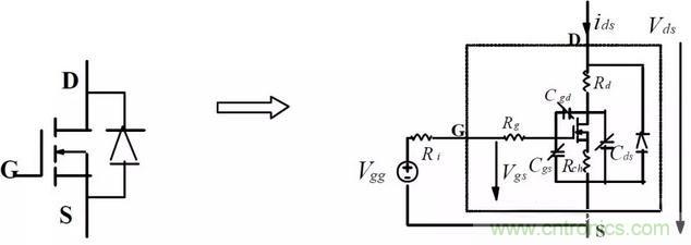 實(shí)際的功率MOSFET 可用三個(gè)結(jié)電容,三個(gè)溝道電阻,和一個(gè)內(nèi)部二極管及一個(gè)理想MOSFET 來等效。三個(gè)結(jié)電容均與結(jié)電壓的大小有關(guān),而門極的溝道電阻一般很小,漏極和源極的兩個(gè)溝道電阻之和即為MOSFET 飽和時(shí)的通態(tài)電阻。