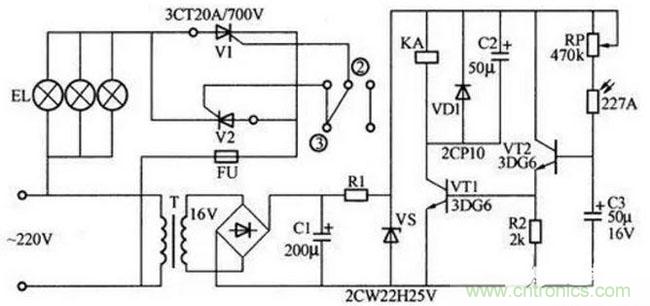 白天在較強(qiáng)光照下,光導(dǎo)管227A(一種光敏電阻)兩端阻值很小,約20~50kΩ,晶體管VT2獲得基極電流而導(dǎo)通,VT1從R2上得到正偏電壓也導(dǎo)通,繼電器線圈KA得電,繼電器的常閉觸電②、③斷開,兩只晶閘管V1和V2沒有觸發(fā)信號而不導(dǎo)通,因而燈泡EL不亮。