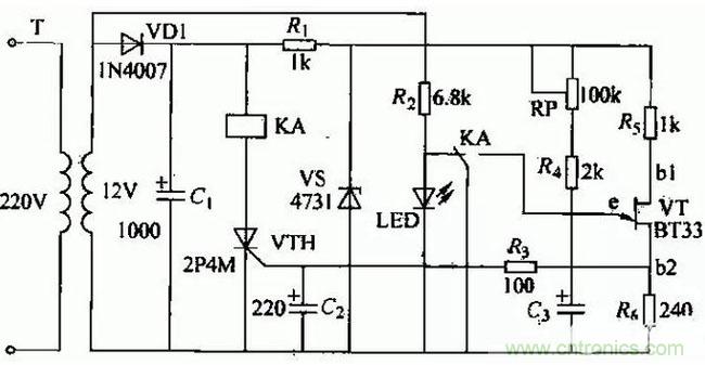 電容G上電壓按指數(shù)規(guī)律逐漸升高,當(dāng)此電壓大于單結(jié)晶體管VT的峰點(diǎn)電壓時,單結(jié)晶體管導(dǎo)通,G經(jīng)VT的eb1極和風(fēng)放電,在風(fēng)上輸出脈沖電壓,觸發(fā)藩閘管VTH導(dǎo)通使繼電器KA吸合,KA的觸頭同時將C3短路,使之迅速放電,單結(jié)晶體管的ebl之間電壓迅速下降,當(dāng)降到Vr.的谷點(diǎn)電壓時,Vr關(guān)閉。同時LED指示燈點(diǎn)亮。當(dāng)切斷電源時,繼電器KA釋放,電路恢復(fù)原始狀態(tài),等待下次動作。通過調(diào)節(jié)RP.可以調(diào)整延時時間。