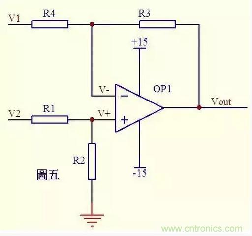 請看圖四。因為虛斷,運放同向端沒有電流流過,則流過R1和R2的電流相等,同理流過R4和R3的電流也相等。故 (V1 – V+)/R1 = (V+ - V2)/R2 ……a (Vout – V-)/R3 = V-/R4 ……b 由虛短知: V+ = V- ……c 如果R1=R2,R3=R4,則由以上式子可以推導(dǎo)出 V+ = (V1 + V2)/2 V- = Vout/2 故 Vout = V1 + V2 也是一個加法器。