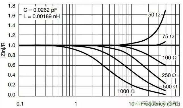 上圖電阻的高頻特性非常好,可以看到極間電容只有0.03pF,引線電感只有0.002nH,其中75Ω的電阻可以到30GHz。我們通常使用的貼片電阻大都是厚膜電阻,性能遠(yuǎn)達(dá)不到如此,其引線電感有幾個(gè)nH,極間電容也有幾個(gè)pF,大多只能用到幾百M(fèi)Hz或幾個(gè)GHz。