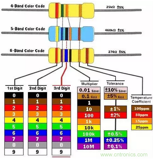 從左往右,前兩個(gè)或三個(gè)環(huán)代表數(shù)字,接下來的環(huán)代表乘數(shù),與前面的數(shù)字相乘便是阻值。再接下來的環(huán)代表電阻的容差,最后就是電阻的溫度系數(shù)。