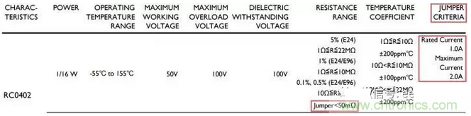 此時(shí),就需要從電阻的規(guī)格書中獲取相關(guān)參數(shù),從下圖可以看出RC0402的零歐姆電阻,其電阻值不會(huì)超過50mΩ,額定電流不超過1A,由此就可以判斷電阻是否滿足設(shè)計(jì)要求。通常0402的零歐姆電阻都可以滿足1A以下的電流要求。