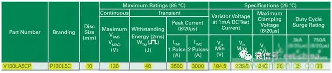 MOV的額定工作電壓,交流場合考慮交流額定電壓,即Vrms或Vm(ac),上圖中的器件可以有效值130V的交流電中正常工作。超過這個(gè)電壓,MOV可能動(dòng)作或者損壞,導(dǎo)致電路無法工作。