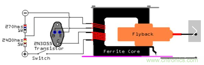 我們可以采用單管自激推高壓包的方法來產(chǎn)生高壓。我們使用一個(gè)2N3055三極管。