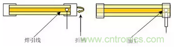 ①內(nèi)銅箔一般加工方法:焊接引線→銅箔兩端平貼于醋酸布中央→折回醋酸布(醋酸布須完全覆蓋住焊點(diǎn))→剪斷醋酸布(銅箔兩邊須留1mm以上),如圖8所示。