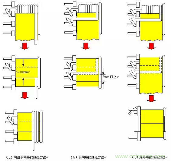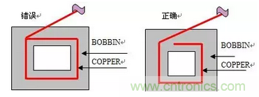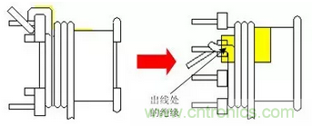 1)銅箔繞法除焊點(diǎn)處必須壓平外銅箔之起繞邊應(yīng)避免壓在骨架轉(zhuǎn)角處,須自骨架的中央處起繞,以防止第二層銅箔與第一層間因擠壓刺破膠布而形成短路,如圖11所示。