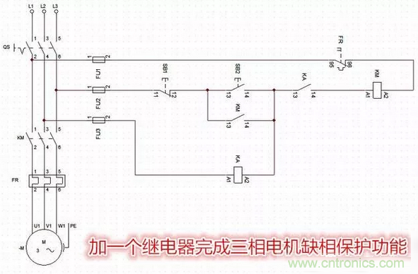 那么有沒有一種比較簡單、實用,又可靠的,而且適合在普通的三相電動機起停保護電路中,安裝的三相電動機缺相保護控制電路呢。大家來看看下面這張三相電動機缺相保護控制線路圖怎么樣,這是我以前收藏下來的最喜歡的一張簡單可靠的三相電動機缺相保護控制線路圖。
