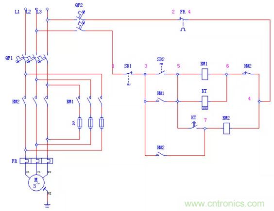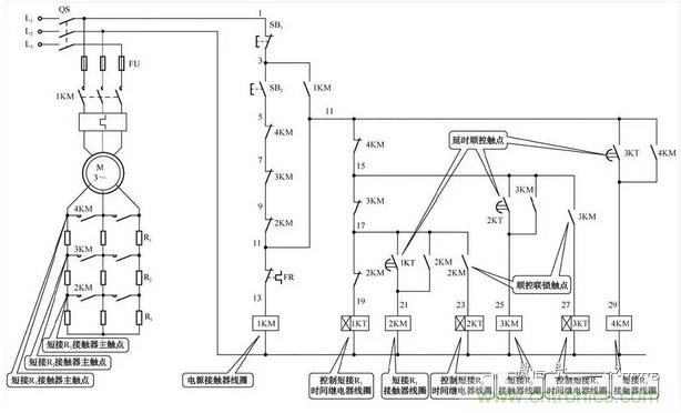 轉(zhuǎn)子回路中的3組啟動(dòng)電阻,由接觸器2KM、3KM、4KM在時(shí)間繼電器1KT、2KT、KT3的控制下被順序短接;在正常工作時(shí),只有接觸器1KM和2KM的主觸點(diǎn)閉合。