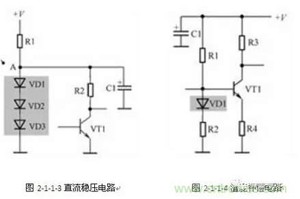 二極管簡易穩(wěn)壓電路中主要利用二極管的管壓降基本不變特性。二極管的管壓降特性:二極管導通后其管壓降基本不變,對硅二極管而言這一管壓降是0.6V左右,對鍺二極管而言是0.2V左右。上圖所示是由普通3只二極管構成的簡易直流穩(wěn)壓電路。電路中的VD1、VD2和VD3是普通二極管,它們串聯(lián)起來后構成一個簡易直流電壓穩(wěn)壓電路。圖2-1-1-3.