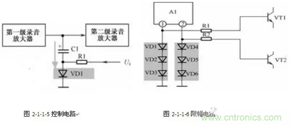 二極管導通之后,它的正向電阻大小隨電流大小變化而有微小改變,正向電流愈大,正向電阻愈?。环粗畡t大。利用二極管正向電流與正向電阻之間的特性,可以構成一些自動控制電路。如圖9-43所示是一種由二極管構成的自動控制電路,又稱ALC電路(自動電平控制電路),它在磁性錄音設備中(如卡座)的錄音電路中經常應用。圖2-1-1-5。