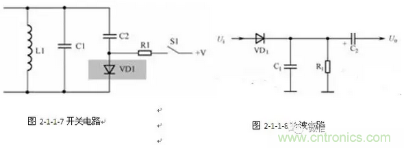 圖所示是二極管檢波電路。電路中的VD1是檢波二極管,C1是高頻濾波電容,R1是檢波電路的負載電阻,C2是耦合電容。圖2-1-1-8。