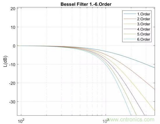 同Butterworth濾波器一樣,其階數(shù)越高,阻帶衰減也就越快,但是從通帶的幅值響應(yīng)看來,其保留通帶部分的能力沒有Butterworth濾波器出色。Bessel濾波器具有最平坦的幅度和相位響應(yīng)。帶通的相位響應(yīng)近乎呈線性。Bessel濾波器可用于減少所有IIR濾波器固有的非線性相位失真。Bessel線性相位濾波器正是由于具有向其截止頻率以下的所有頻率提供等量延時的特性,才被用于音頻設(shè)備中。在音頻設(shè)備中,必須在不損害頻帶內(nèi)多信號的相位關(guān)系前提下,消除帶外噪聲。