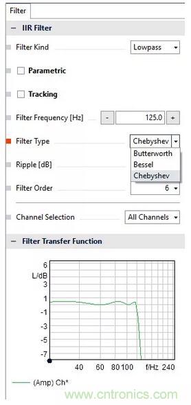 有三種IIR濾波器可供選擇,分別為切比雪夫I型、貝塞爾以及巴特沃斯濾波器。對于不同類型的濾波器可自定義參數(shù)。比如對于巴特沃斯濾波器需要定義截止頻率和濾波器階數(shù),如果是帶通或者帶阻,還需要確定通帶/阻帶帶寬;如果是切比雪夫濾波器的話,還需要確定波動值。