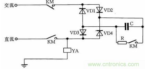 快速退磁的工作原理是:直流電磁鐵斷電后,交流電源通過(guò)橋式整流器和YA向電容C充電,隨著電容C兩端電壓的不斷升高,充電電流越來(lái)越小,而通過(guò)YA的電流又是交變的,從而使電磁鐵快速退磁。電容C的容量要根據(jù)電磁鐵的實(shí)際情況現(xiàn)場(chǎng)試驗(yàn)決定。R為放電電阻。