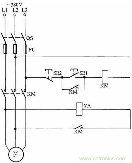 圖中SB2為停止按鈕,在停止時(shí),按動(dòng)SB2的時(shí)間要長(zhǎng)一點(diǎn)。否則,手松開(kāi)按鈕后,接觸器又吸合,使電動(dòng)機(jī)繼續(xù)運(yùn)行。這是因?yàn)殡娫措妷弘m被切斷,但由于慣性的作用,電動(dòng)機(jī)轉(zhuǎn)子仍然轉(zhuǎn)動(dòng),其定子繞組會(huì)產(chǎn)生感應(yīng)電動(dòng)勢(shì),一旦停止按鈕很快復(fù)位,感應(yīng)電動(dòng)勢(shì)直接加在接觸器線圈上,使其再次吸合,電動(dòng)機(jī)繼續(xù)運(yùn)轉(zhuǎn)。