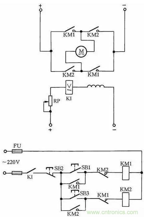 在勵(lì)磁電路內(nèi),串聯(lián)一個(gè)欠電流繼電器KI,其常開(kāi)觸點(diǎn)接在控制電路中。當(dāng)勵(lì)磁電流消失或減小到設(shè)定值時(shí),KI釋放,KI常開(kāi)觸點(diǎn)斷開(kāi),切斷電動(dòng)機(jī)電樞電源,使電動(dòng)機(jī)停轉(zhuǎn),從而避免超速現(xiàn)象發(fā)生,見(jiàn)圖11。
