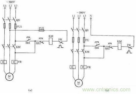接觸器線圈電壓為380V時(shí),可按圖12(a)所示接線;接觸器線圈電壓為220V時(shí),可按圖12(b)接線。圖12(a)的接線還有缺陷,即在電動(dòng)機(jī)停轉(zhuǎn)時(shí),其引出線及電動(dòng)機(jī)帶電,使維修不大安全。因此,這種線路只能在應(yīng)急時(shí)采用,并在維修電動(dòng)機(jī)時(shí),應(yīng)斷開(kāi)控制電動(dòng)機(jī)的總電源開(kāi)關(guān)QS,這一點(diǎn)應(yīng)特別注意。