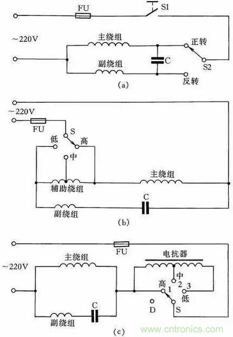圖16(b)為帶輔助繞組的接線線路,撥動(dòng)開(kāi)關(guān)S,可改變輔助繞組的抽頭,即改變主繞組的實(shí)際承受電壓,從而改變電動(dòng)機(jī)的轉(zhuǎn)速,此接線方法常用于電風(fēng)扇上。