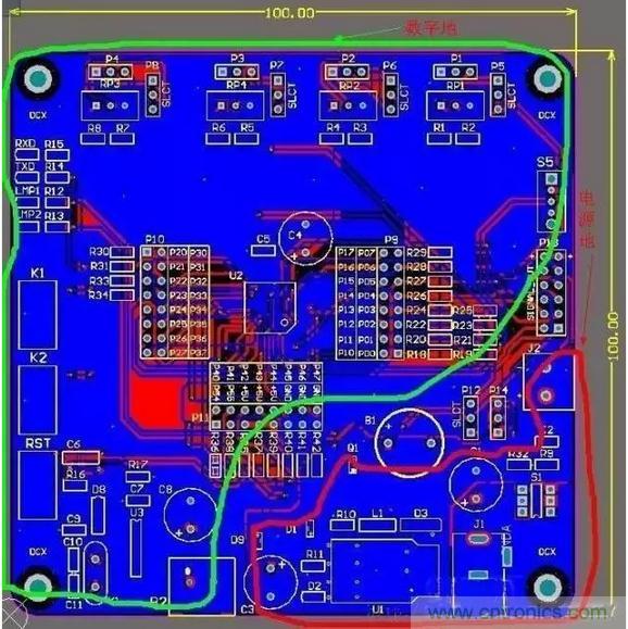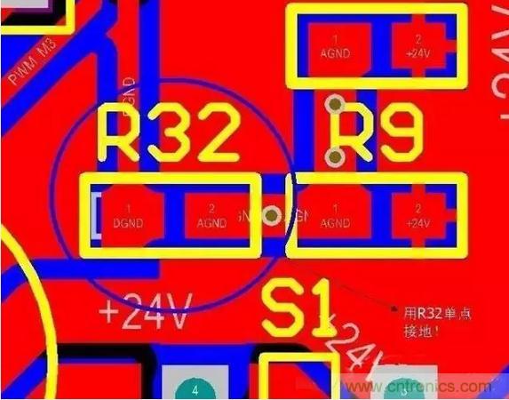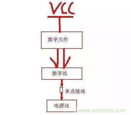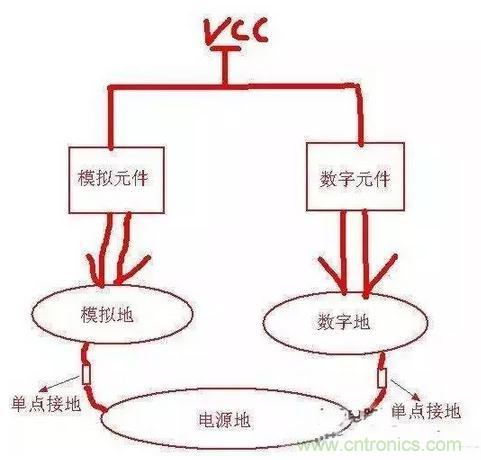 從此圖可以看出:只在電源地和數(shù)字地之間用一個0歐電阻或磁珠之類的單點接地就行了,同樣單點接地的位置應(yīng)該盡量靠近板子電源地的入口(起始位置)。
