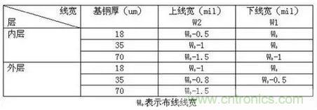 我們會(huì)以為導(dǎo)線的橫截面是一個(gè)矩形,但實(shí)際上卻是一個(gè)梯形。以TOP層為例,當(dāng)銅箔厚度為1OZ時(shí),梯形的上底邊比下底邊短1MIL。比如線寬5MIL,那么其上底邊約4MIL,下底邊5MIL。上下底邊的差異和銅厚有關(guān),下表是不同情況下梯形上下底的關(guān)系。