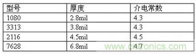 介電常數(shù):半固化片的介電常數(shù)與厚度有關(guān),下表為不同型號(hào)的半固化片厚度和介電常數(shù)參數(shù):