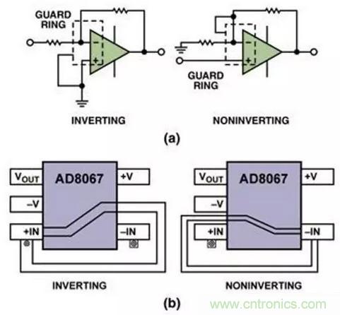 (公式七)保護環(huán),或者稱隔離環(huán),是運算放大器常用的另一種遮罩方法,它用于防止寄生電流進入敏感結(jié)點。其基本原理很簡單,用一條保護導(dǎo)線將敏感結(jié)點完全包圍起來,導(dǎo)線保持或者迫使它保持(低阻抗)與敏感結(jié)點相同的電勢,因此使吸收的寄生電流遠離了敏感結(jié)點。(圖十五)(a)顯示了用于運算放大器反相配置和同相配置中保護環(huán)的原理圖。圖十五(b)則顯示用于SOT-23-5封裝中兩種保護環(huán)的典型佈線方法。