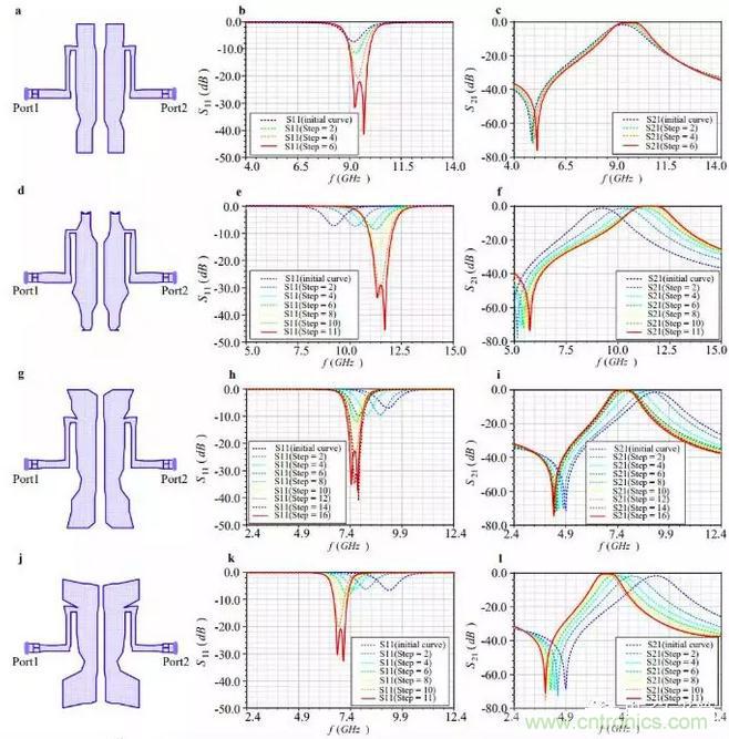 第二項任務和第三項任務的AI首先學會調整諧振器的長度,以達到移動中心頻率的目的,然后調整諧振器之間的耦合系數,以減少通帶回波損耗,增加插入損耗,其設計過程如圖3(d-i)所示。