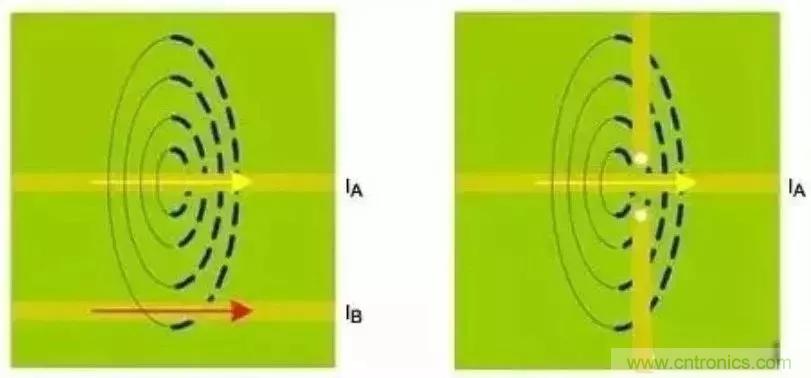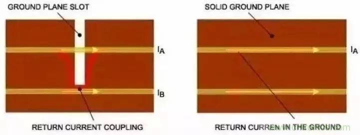 直流電流總是傾向于沿著低阻通路流通。同理,高頻電流也是優(yōu)先流過最低電阻的通路。所以,對于地層上方的標(biāo)準(zhǔn)PCB微帶線,返回電流試圖流入引線正下方的接地區(qū)域。按照上述引線耦合部分所述,割斷的接地區(qū)域會引入各種噪聲,進而通過磁場耦合或匯聚電流而增大串?dāng)_(圖7)。