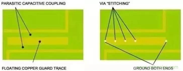 填充地也稱為保護線,通常將其用于電路中很難鋪設(shè)連續(xù)接地區(qū)域或需要屏蔽敏感電路的設(shè)計(圖8)。通過在引線兩端,或者是沿線放置接地過孔(即過孔陣列),增大屏蔽效應(yīng)。請不要將保護線與設(shè)計用來提供返回電流通路的引線相混合,這樣的布局會引入串?dāng)_。