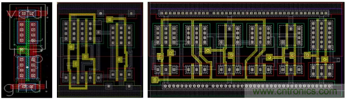 對(duì)于標(biāo)準(zhǔn)單元的版圖,根據(jù)工藝要求,標(biāo)準(zhǔn)邏輯單元的高度是固定的,寬度為最小單元寬度的公約數(shù)倍數(shù),例如在圖3中,左圖為反向器(inverter,INV)的版圖,中圖為選擇器(multiplexer,MUX)的版圖,右圖為D型寄存器的(D-Flip Flop, DFF)的版圖。如上所述,從版圖設(shè)計(jì)中,可以導(dǎo)出并建立GDSII和LEF文件。GDSII文件經(jīng)過設(shè)計(jì)簽核(design sign-off)過程由代工廠使用于芯片制造,LEF文件用于全芯片的P&R物理設(shè)計(jì)。