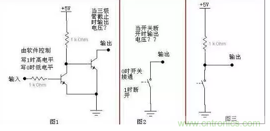 圖3中那個1k的電阻即是上拉電阻。如果開關(guān)閉合,則有電流從1k電阻及開關(guān)上流過,但由于開關(guān)閉和時電阻為0(方便我們的討論,實際情況中開關(guān)電阻不為0,另外對于三極管還存在飽和壓降),所以在開關(guān)上的電壓為0,即輸出電平為0。如果開關(guān)斷開,則由于開關(guān)電阻為無窮大(同上,不考慮實際中的漏電流),所以流過的電流為0,因此在1k電阻上的壓降也為0,所以輸出端的電壓就是5v了,這樣就能輸出高電平了。