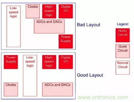 第一個布局中放置時鐘和數(shù)據(jù)轉(zhuǎn)換器在相鄰于噪聲器件的附近。噪聲將會耦合到敏感電路及降低他們的性能。第二個布局做了有效的電路隔離將有利于系統(tǒng)設(shè)計的信號完整性。