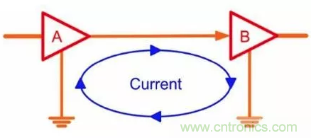 在電流環(huán)路設(shè)計中會被數(shù)字電路設(shè)計者忽視的因素,包括對單端信號在兩個門電路間傳送的考慮(圖2)。從門 A 流向門 B 的電流環(huán)路,然后再從地平面返回到門 A。