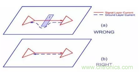 在 PCB 設(shè)計中一個常見的錯誤是在層間打過孔和開槽。圖3顯示了當(dāng)一條信號線在一個開過槽的不同層上的電流流向?;芈冯娏鲗⒈黄壤@過開槽,這就必然會產(chǎn)生一個大的環(huán)流回路。