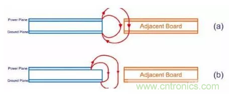在板卡的邊緣存在電源平面層對地平面層的輻射效應(yīng)。從邊沿泄漏的電磁能量將破壞臨近的板卡。見下圖4a。適當(dāng)?shù)臏p少電源平面層的面積(圖4 b),以至于地平面層在一定的區(qū)域內(nèi)交疊。這將減少電磁泄漏對鄰近板卡的影響。