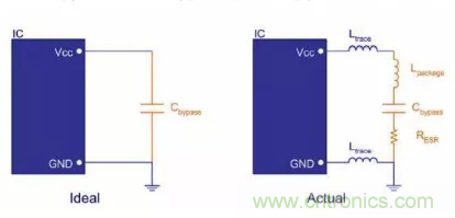 最簡單的解決電源噪聲方式是利用電容對地上的高頻噪聲去耦。理想的退耦電容為高頻噪聲提供了一條對地的低阻通路,從而清除了電源噪聲。